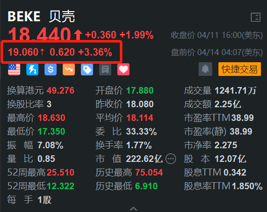 贝壳(BEKE.US)美股盘前涨3.3%。消息上,公司近期持续回购股份,上周五再度耗资约500万美元回购82.94万股股份。今年以来,受一系列楼市调整优化政策的影响,楼市回暖态势明显。(格隆汇)