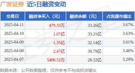 广发证券:4月11日融资净买入479.33万元,连续3日累计净买入2.47亿元