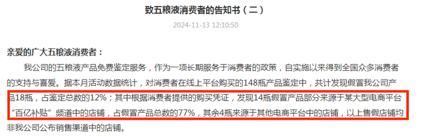 双十一后两天,五粮液发文指出,对消费者在线上平台购买的148瓶产品鉴定中,共计发现假冒产品18瓶,占鉴定总数的12%。其中,14瓶假冒产品部分来源于某大型电商平台“百亿补贴”频道中的店铺;其余4瓶来源于其他电商平台中的店铺,售假店铺均非五粮液公布销售渠道中的店铺。