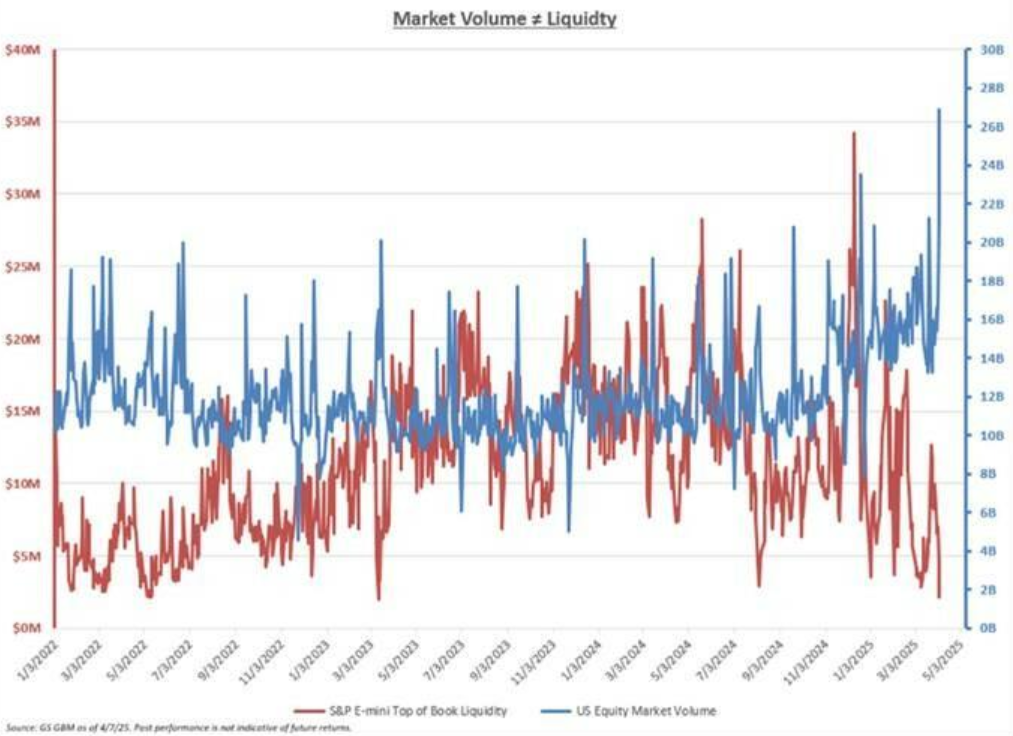 无论如何,正如高盛的迈克-华盛顿(Mike Washington)所写,尽管出现了这些变动,但市场活动并未真正回暖,标普500指数的交易量在本周缩短的交易周中(周五是耶稣受难日,欧美多地休市)趋于枯竭,与10天的平均水平相比,周三的交易量下降了38%,流动性仍然糟糕透顶,标准500指数的顶级订单流动性(top book liquidity,反映了快速转移风险的能力)仅为294万美元。