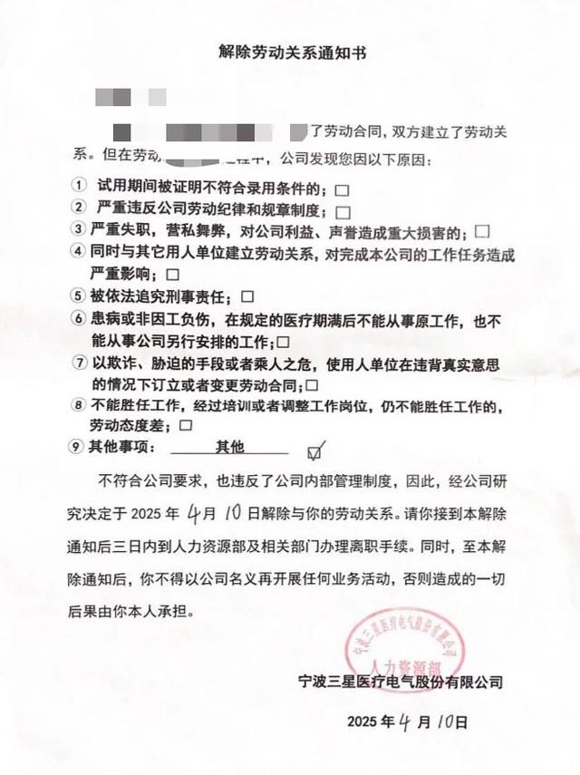 一份来自宁波三星医疗电气股份有限公司(下称“三星医疗”)的《解除劳动关系通知书》显示,其发给员工的裁员原因是“其他”,并要求员工三日内办理离职手续。