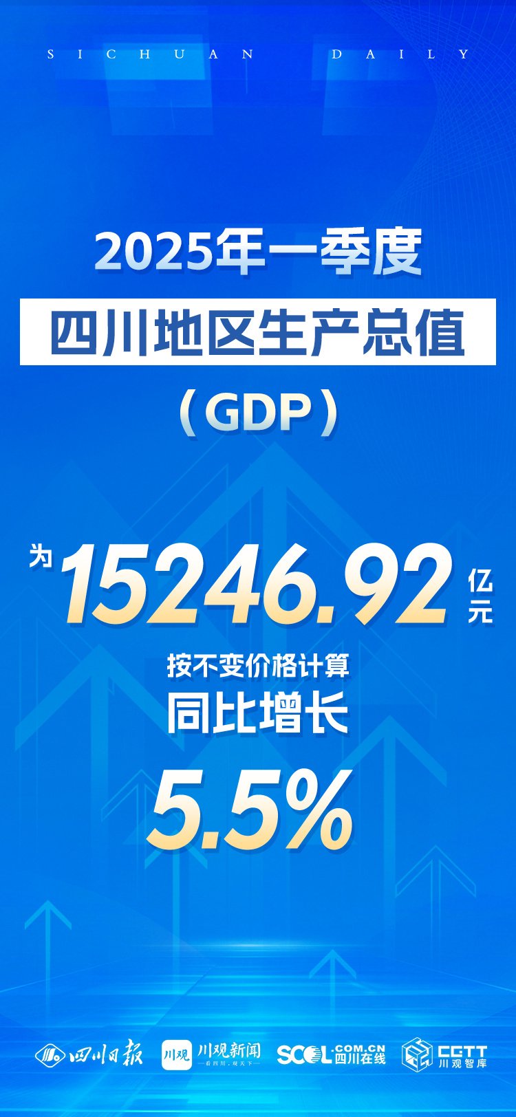 4月17日,记者从省政府新闻办召开的2025年一季度四川经济形势新闻发布会上获悉,根据地区生产总值统一核算结果,2025年一季度四川地区生产总值(GDP)为15246.92亿元,按不变价格计算,同比增长5.5%。