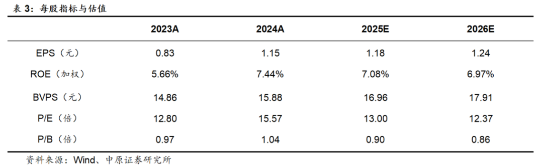 预计公司2025年、2026年EPS分别为1.18元、1.24元,BVPS分别为16.96元、17.91元,按4月15日收盘价15.34元计算,对应P/B分别为0.90倍、0.86倍,维持“增持”的投资评级。