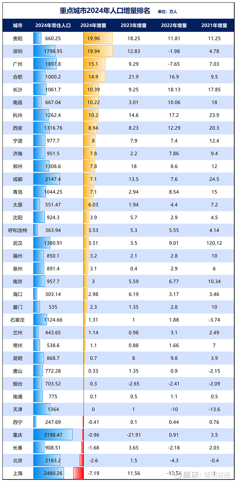 制图:城市财经;数据:各城市统计局与之形成鲜明对比的是,同处西南的贵阳,人口增量相当可观。