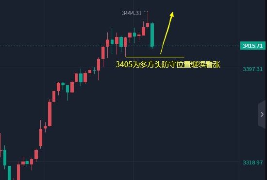 今日早盘价格回撤止步3411一线,隔夜回撤低点在3405一线,守住3405起涨点继续多,以3405为多头防守位置直接多即可,目前黄金报价3415,现价黄金3415直接多,防守3405,目标看向3440。