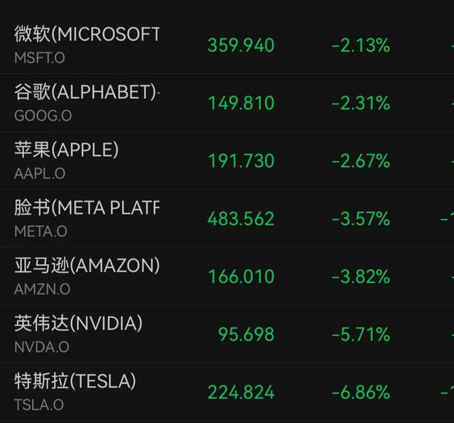 科技七巨头集体走低。特斯拉盘中一度跌超7%、英伟达一度跌超5.7%。