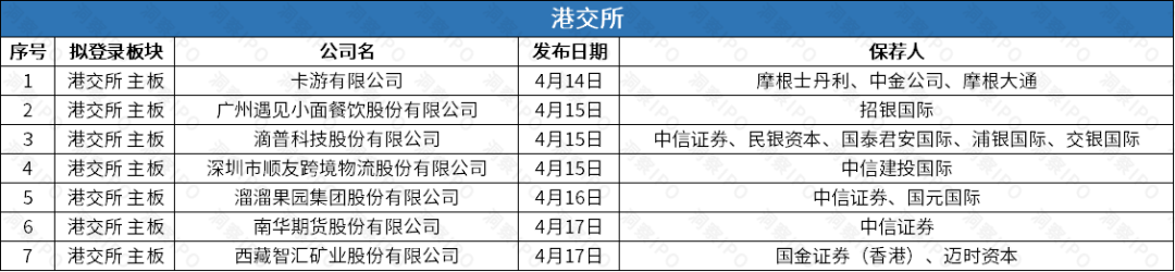 4月14日-4月20日,港交所有7家公司递交主板上市申请。