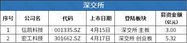 4月14日-4月20日,上交所主板有1家公司上市,深交所主板有1家公司上市,创业板有1家公司上市。