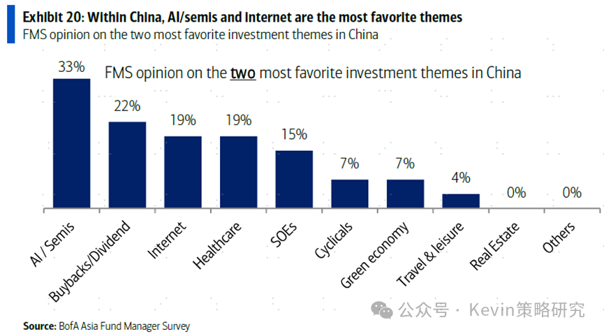 5. 中国市场内部,依然最为看好AI和半导体,回购和分红快速升至第二,然后是互联网和医药。