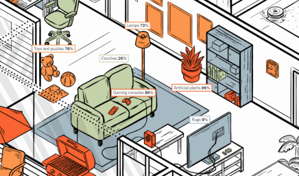 △《纽约时报》可视化报道,展现一个普通美国家庭对中国进口产品的依赖比例程度。灰色表示这一品类从中国进口率为0-20%,绿色为20%-40%,黄色为40%-60%,橙色为60%-80%,红色为80%-100%