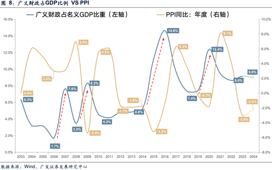在中美对等关税之前,根据两会政府工作报告,我们测算广义财政占GDP的比例相对22-24年,有大约1.5%-2%的提升幅度,对应PPI可能有一定程度中枢提升。(历史4次经验看,一轮PPI的趋势上行,需要广义财政占GDP比例5个百分点的提升,如下图)。