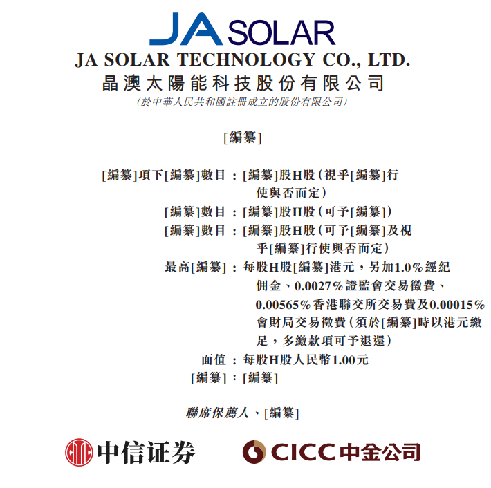 据港交所4月28日披露,晶澳太阳能科技股份有限公司(简称:晶澳科技(002459.SZ))递表港交所主板,中信证券和中金公司为联席保荐人,公司正式冲击“A+H”两地上市。
