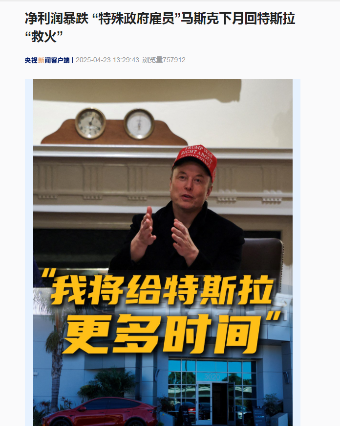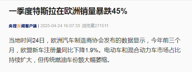 图:央视新闻客户端特斯拉一季度业绩弱于预期