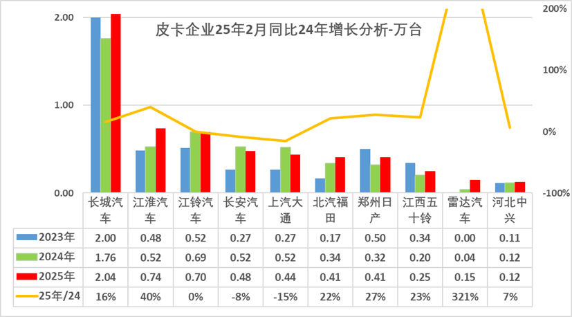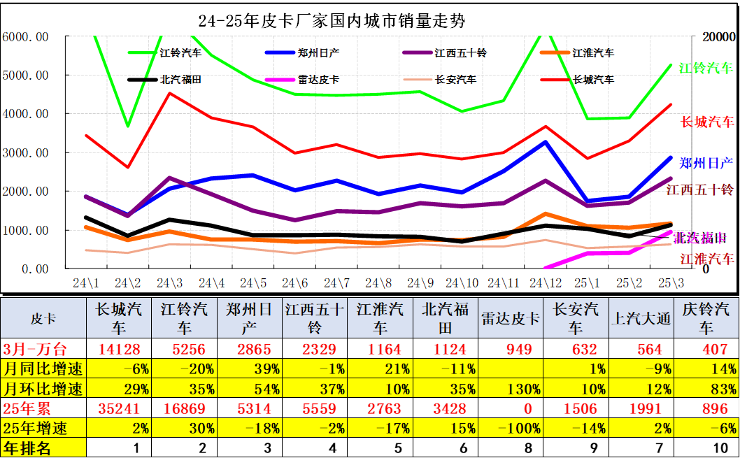 2025年皮卡市场主力厂商表现较好,长城汽车保持绝对优势地位,长安汽车3月出口市场表现很强,江淮汽车、江铃汽车3月走势较强,长安汽车和上汽大通等保持强势国内主力地位。