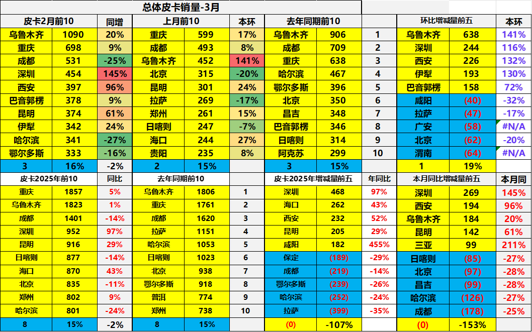 3月全国皮卡销量主力城市是乌鲁木齐、重庆、成都、深圳、西安、昆明等西南、东北和西北地区。深圳等东部大城市需求有一定规模。随着电动皮卡推出,深圳近期表现较强。