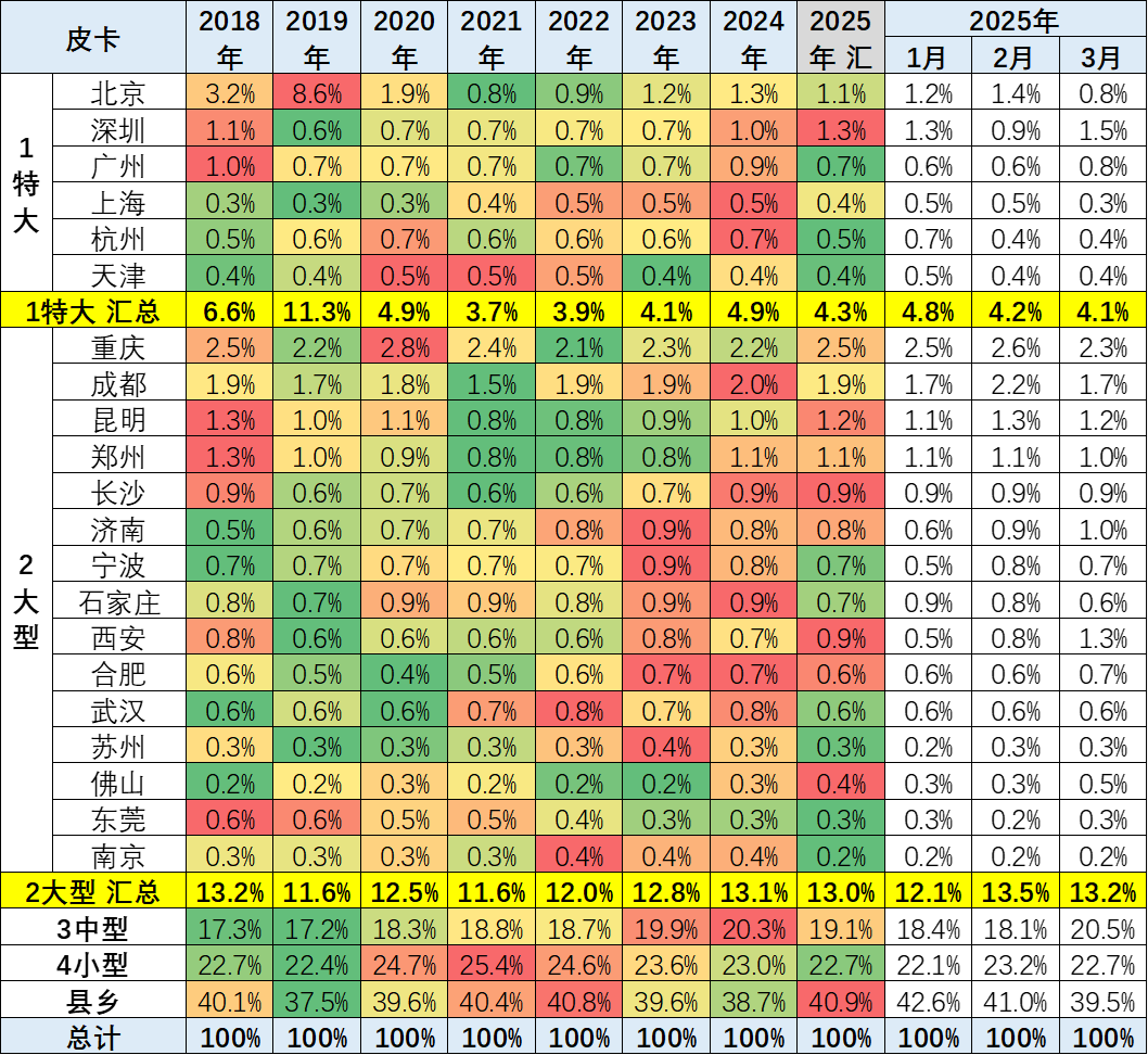 皮卡市场主力销售区域还是在以中小城市和县乡市场为主,但随着电动化和乘用化皮卡的推出,大城市需求得到改善。2025年3月大型城市和深圳等限购市场表现较好。而县乡市场近期大幅走强,燃油皮卡的大城市市场目前来看并没有明显的突破特征。3月县乡市场的表现相对1月回落较大。