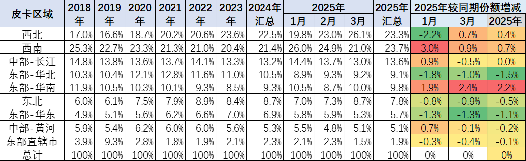 皮卡市场的主力区域在西南、西北为主,西部地区的皮卡需求较大。3月西北地区的皮卡需求表现较强。目前来看,2025年3月西南、西北地区的皮卡需求占到总体需求的47%,成为两大核心市场,其中今年西南市场规模较大。
