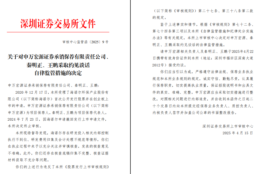 为此,深交所约谈申万宏源相关负责人及秦明正、王鹏两名保荐代表人。同时要求申万投行采取切实措施进行整改,对照相关问题进行内部追责,限期提交经保荐业务负责人、质控负责人、内核负责人签字并加盖公司公章的书面整改报告。