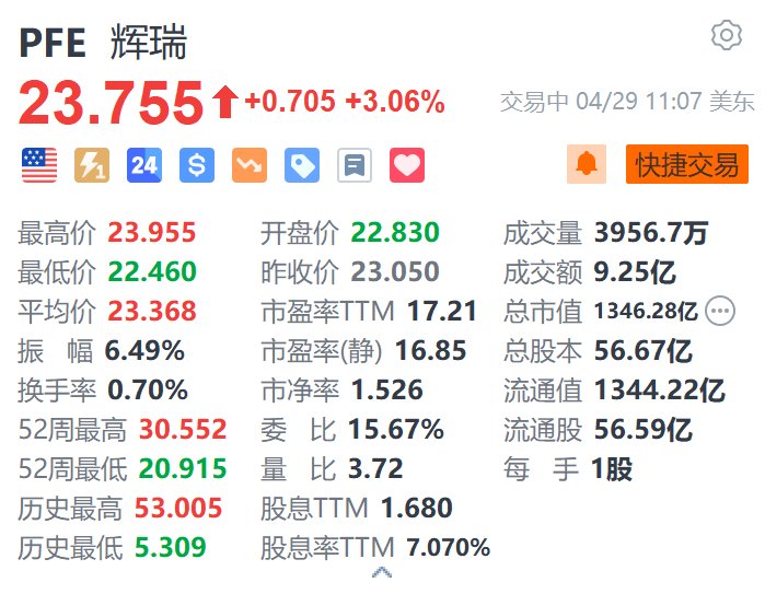 格隆汇4月29日|辉瑞(PFE.US)涨超3%,报23.755美元。消息面上,辉瑞周二公布,在加大成本削减力度下,首季净利润同比跌约5%至29.7亿美元,经调整每股盈利92美仙,远高于市场预期的66美仙;营收同比跌8%至137.2亿美元,反映其抗病毒药物Paxlovid的收入减少。公司预计,通过两项成本削减措施,到2027年底将节省约77亿美元。公司维持对2025年全年财报的预期,预计销售额为610亿至640亿美元,惟补充该指引目前不包括与未来关税和贸易政策变化相关的任何潜在影响。