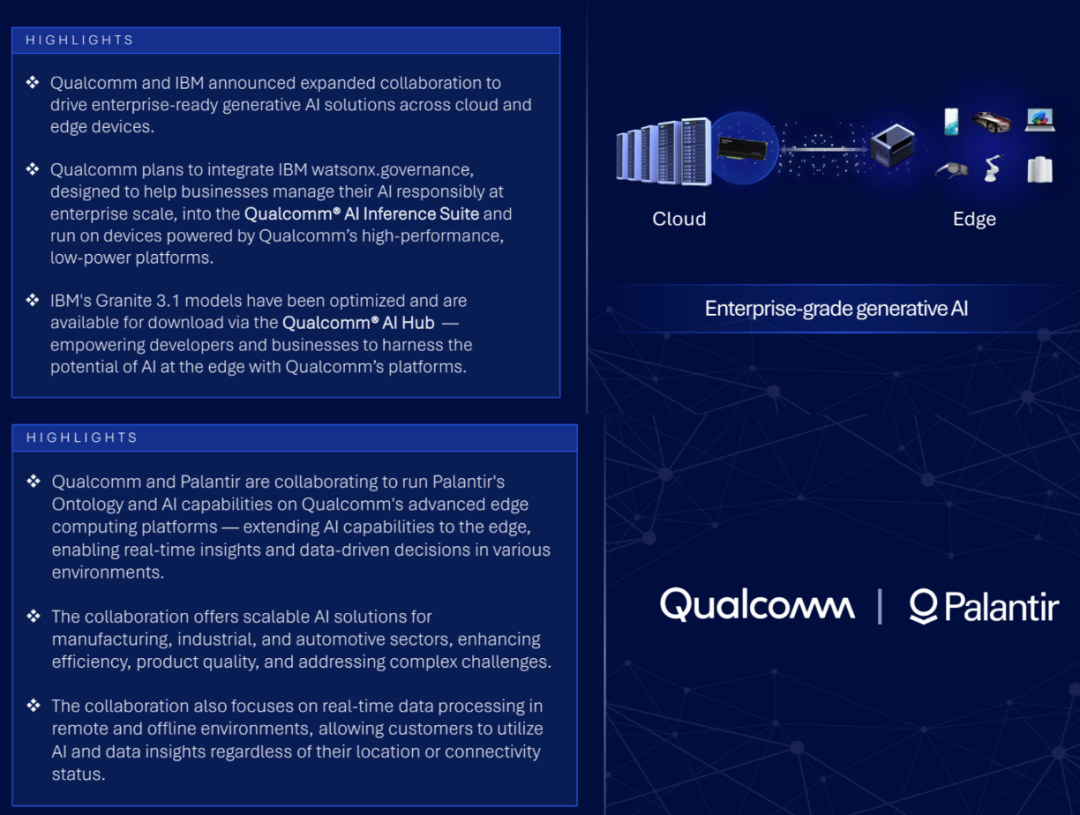 高通的生态建设还体现在与IBM、Palantir等企业的合作,共同开发企业级生成式AI解决方案,将高通的芯片和AI技术扩展至云边缘混合场景,覆盖金融、制造和医疗等行业,提升了其市场覆盖面。