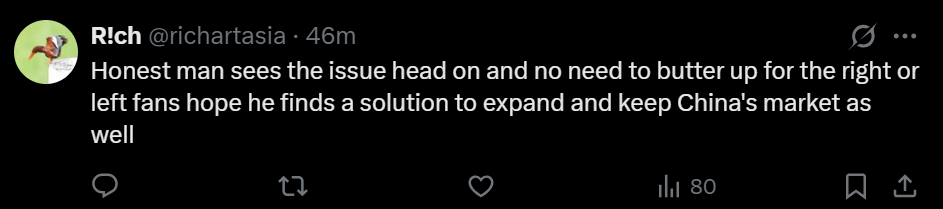 “诚实的人看到了这个问题的正面,没有必要奉承右翼或左翼的粉丝,希望他也能找到一个扩大和保持中国市场的解决方案。”
