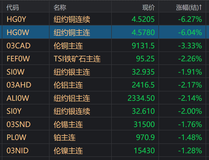 外盘工业金属全线下跌。纽约铜期货跌幅扩大至6%,伦铜跌超3%。伦铝、伦锡、伦镍均跌超1%。