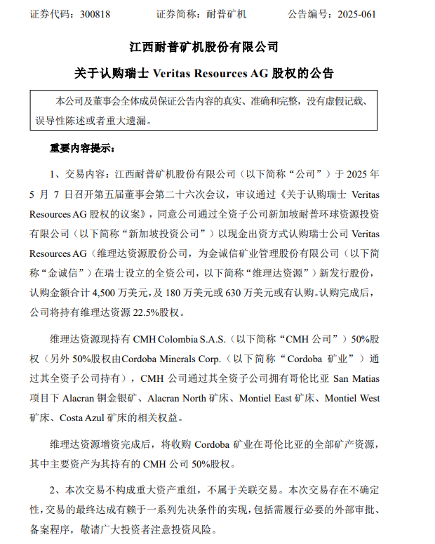 5月8日,耐普矿机(300818.SZ)公告称,公司拟通过全资子公司新加坡耐普环球资源投资有限公司以现金出资方式认购瑞士公司Veritas Resources AG新发行股份,认购金额合计4500万美元,及180万美元或630万美元或有认购。认购完成后,公司将持有维理达资源22.5%股权。维理达资源现持有CMH Colombia S.A.S.50%股权,CMH公司通过其全资子公司拥有哥伦比亚San Matias项目下Alacran铜金银矿的相关权益。