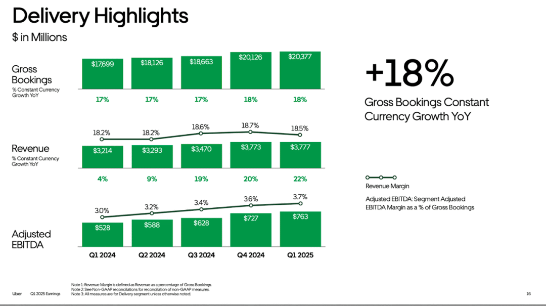 令人惊讶的是,配送业务正成为 Uber 的盈利引擎。本季度,该部门的总预订量利润率为 3.7%(比去年同期提高了 70 个基点)。这听起来可能不多,但对于 Uber 这样规模的企业来说,这可谓意义非凡。这一增长主要得益于广告收入以及大规模运营带来的效率提升。此外,Uber 还证实,其杂货和零售配送服务(上季度才刚刚实现收支平衡)现在实际上正在为利润做出贡献。更令人印象深刻的是,配送部门本季度的利润率增量为 9%。这表明,随着业务的增长,这部分业务的盈利能力将大幅提升。