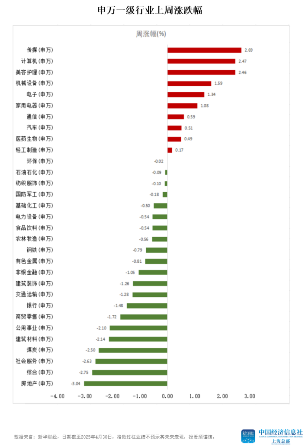 从申万一级行业来看,上周行业指数多数下跌,传媒、计算机、美容护理、机械设备、电子等行业指数涨幅居前,房地产、综合、社会服务、煤炭、建筑材料等行业指数跌幅靠前。