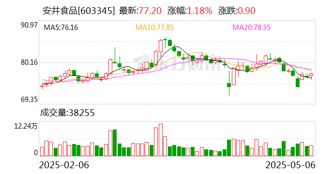 截至5月6日收盘,安井食品股价报77.2元/股,总市值约226亿元。