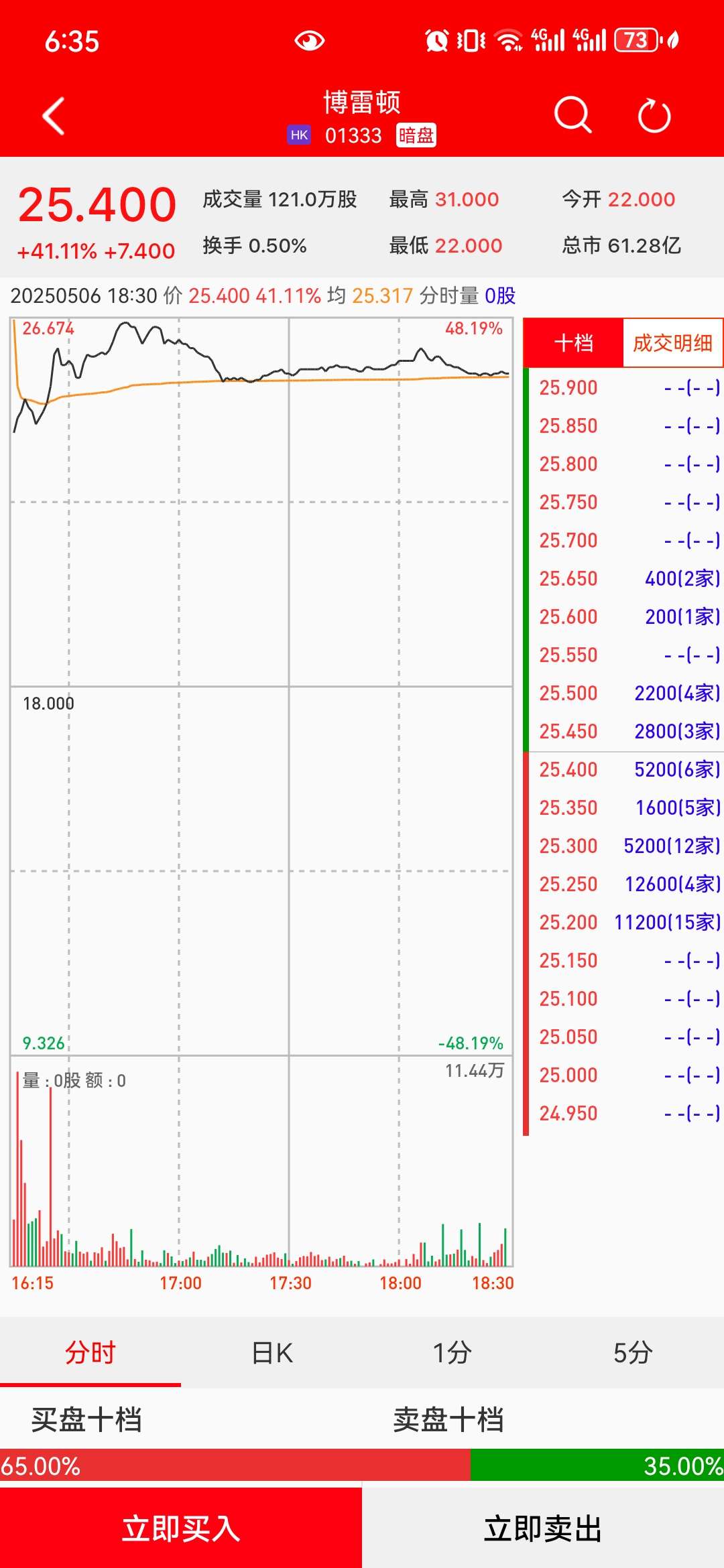 博雷顿(01333)将于5月7日(周三)在香港挂牌。截至收盘,利弗莫尔证券暗盘交易显示报价25.40港元,较招股价18港元上涨41.11%,每手200股,不计手续费,每手赚1480港元。