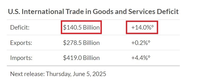 美国商务部下属的经济分析局和人口普查局最新公布的数据显示,美国3月国际贸易逆差较2月大增14%,达到创纪录的1405亿美元,远超外界预期。