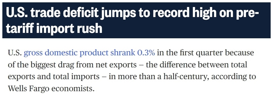 美国全国广播公司报道截图虽然经济学家预计进口热潮到5月将会消退,但他们同时警告说,由于其他国家广泛抵制美国商品和赴美旅行,进口下降的效果可能会被出口下降所抵消。