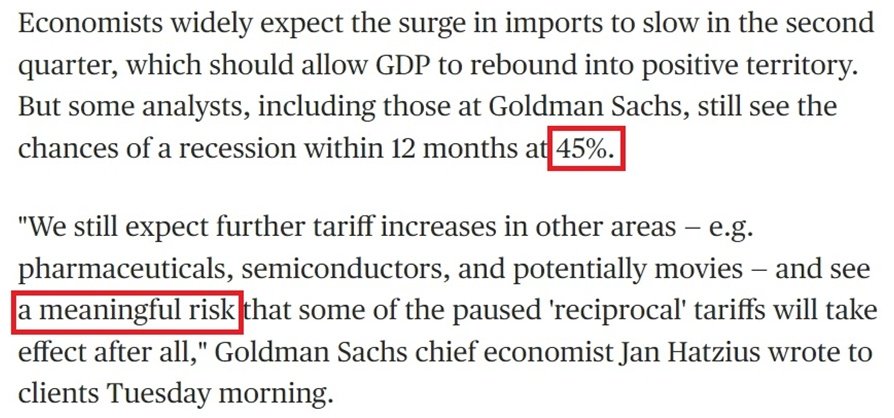 高盛集团首席经济学家哈祖斯日前致信提醒该公司客户:“我们预计其他领域的关税会进一步提高,比如药品、半导体,可能还有电影。而且我们认为,一些暂停的‘对等’关税最终会生效,这是一个很大的风险。”