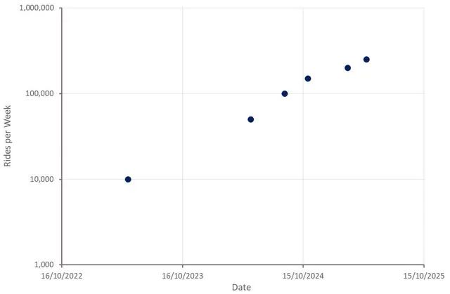 截至 2024 年底,Waymo 的纯乘客行驶里程已达约 5000 万英里。目前,该公司每周在旧金山、菲尼克斯、洛杉矶和奥斯汀提供约25 万次付费乘车服务,其商业车队拥有超过1500 辆汽车。Uber 近期表示,Waymo在奥斯汀运营着约 100 辆汽车,这些汽车每天的出行次数超过了奥斯汀 99% 的 Uber 司机。Waymo 最近将业务扩展到硅谷和奥斯汀,并计划在不久的将来在亚特兰大、华盛顿特区和迈阿密推出服务。该公司最近还开始使用25 辆载人汽车绘制东京街道地图,这是该公司首次进军国际市场。