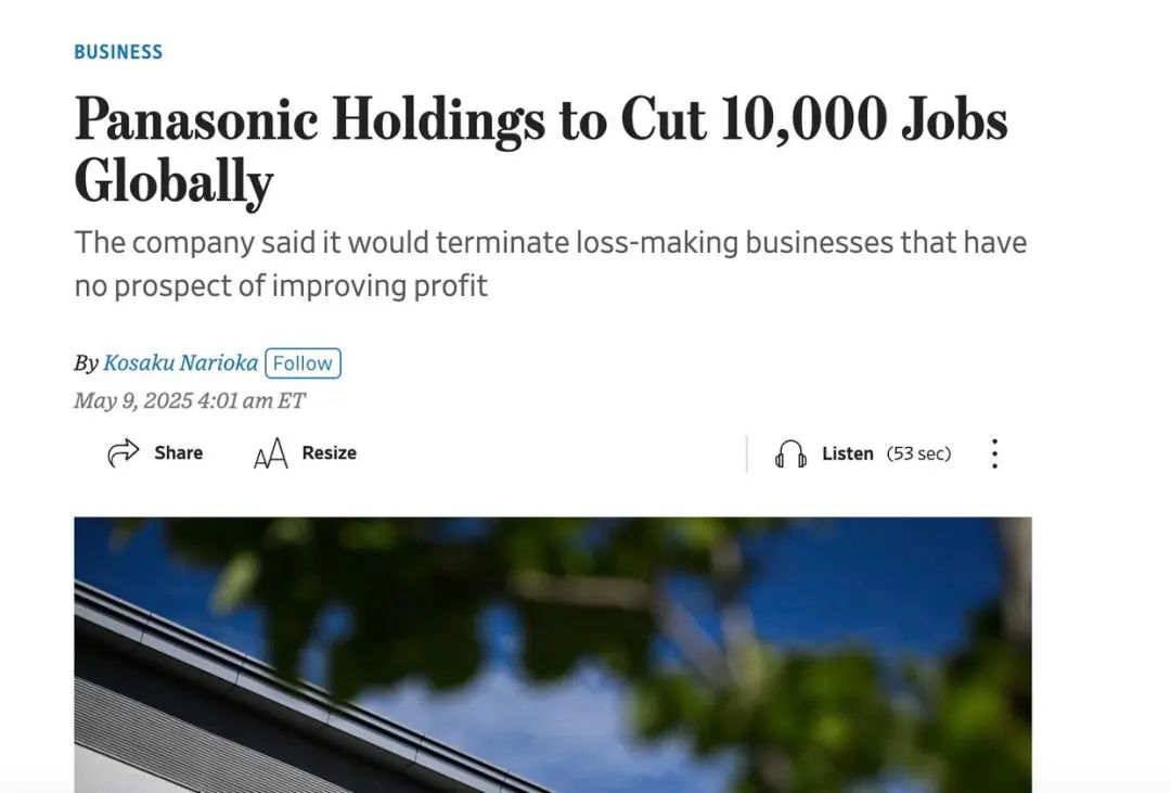 5月9日,松下集团宣布,计划于2025年度至2026年度在全球范围内裁员1万人,其及5000名日本员工和5000名海外员工。