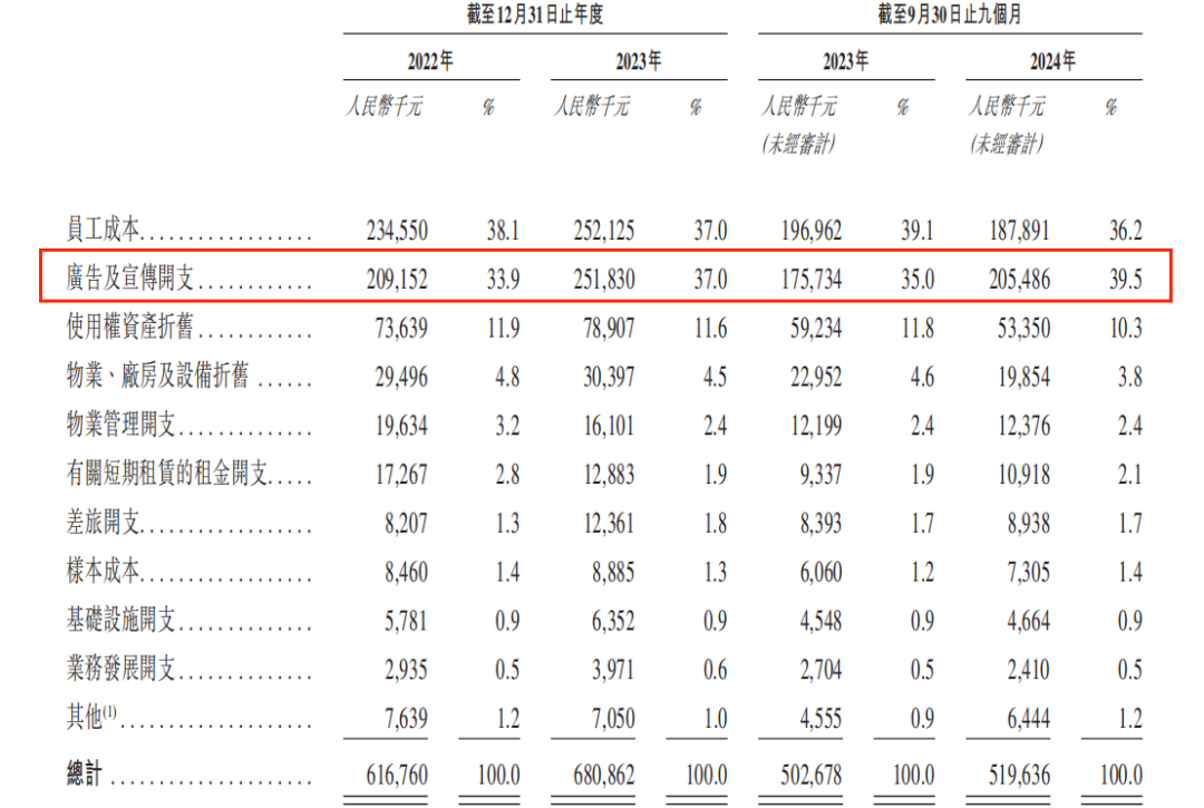 其中广告及宣传开支占比超过三分之一,尤其是2024年前三季度,广告及宣传开支首次超过员工成本,说明公司不得不在广告宣传上加大力度。