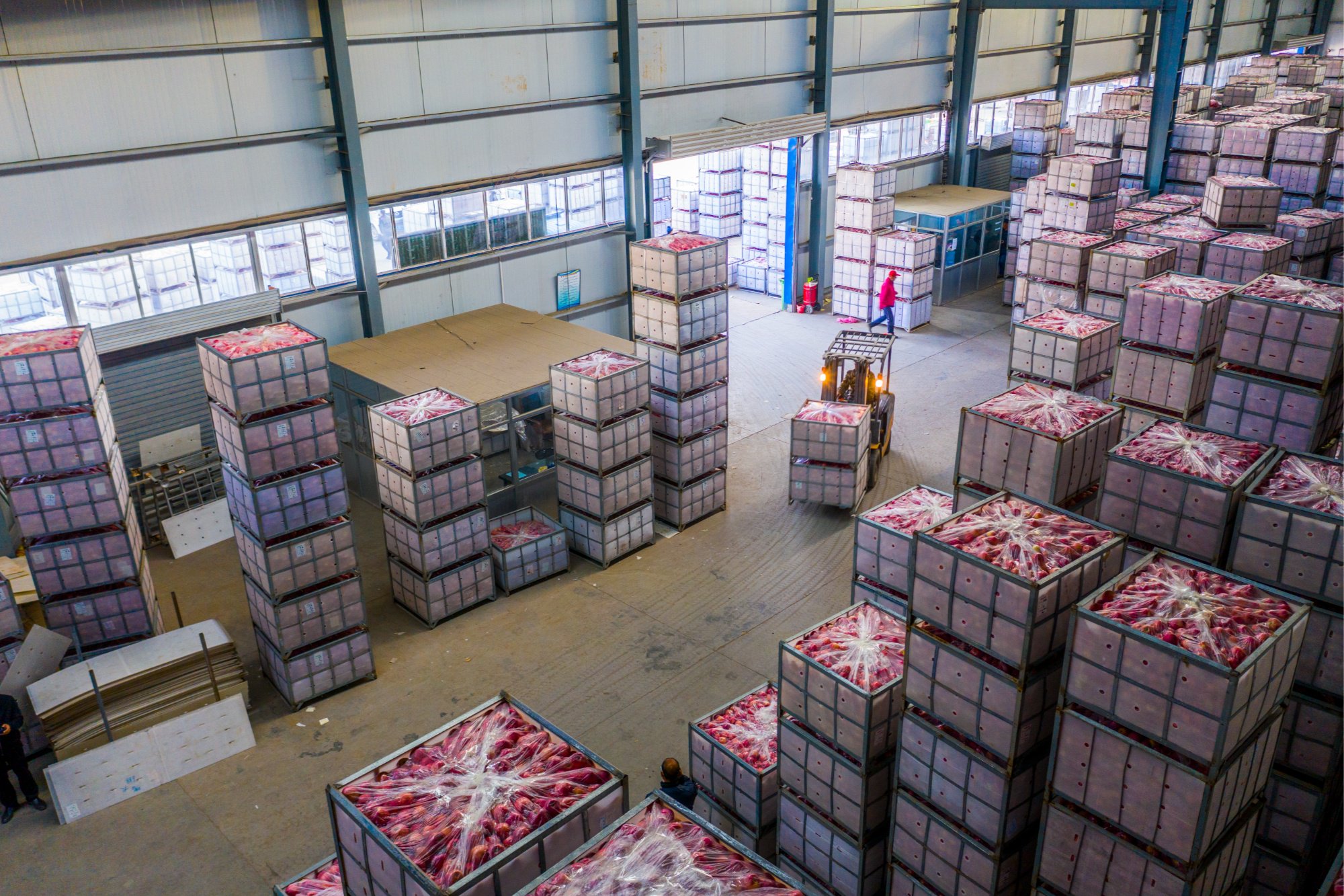 气调库里储存的苹果(李云 摄)2018年,金诚果蔬有限公司成立了南庄分公司,建成冷藏保鲜库50座,年存储能力可达2.5万吨,有效解决了当地群众苹果存放难的问题。