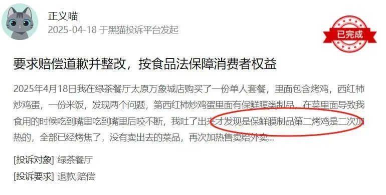 有网友投诉,菜品里吃出保鲜膜,认为食品是二次加热;