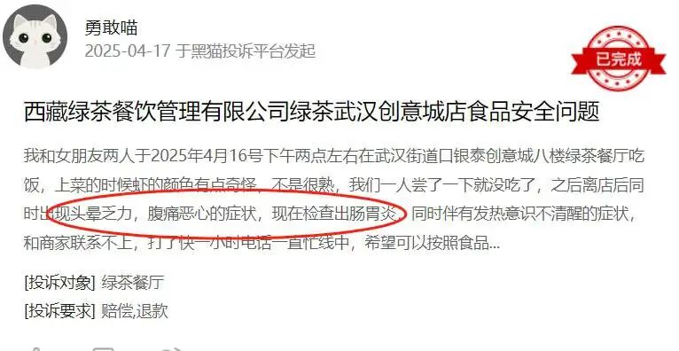 有网友投诉,吃完绿茶餐厅后出现头晕乏力,腹痛恶心,还检查出肠胃炎。
