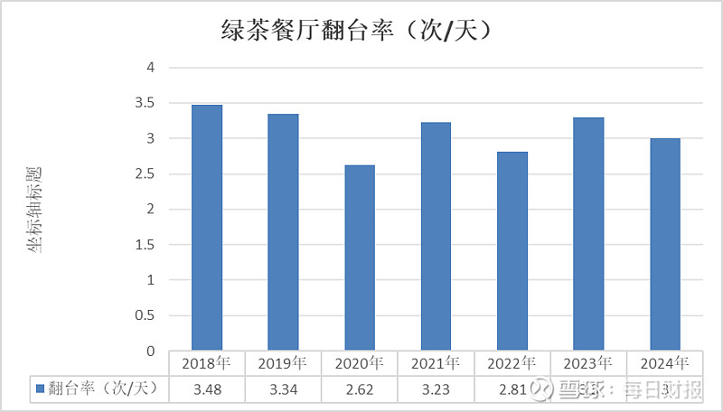 整体翻台率从3.3次/日下滑至3次/日。2021年至2023年,绿茶餐厅整体翻台率分别为3.23次/日、2.81次/日、3.3次/日。