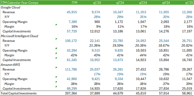 在谷歌云平台 (GCP) 和人工智能 (AI) 产品的推动下,谷歌云 (Google Cloud) 在 2025 年第一季度环比增长了 28%。该部门本季度的运营利润率也显著提升,环比增长 25 个基点,较 2024 年第一季度增长 836 个基点,这得益于效率、生产力和利用率的提升。尽管谷歌云在运营利润率方面仍落后于其他超大规模云服务提供商,但这一提升将使 Alphabet 走上追赶同行的正确轨道。