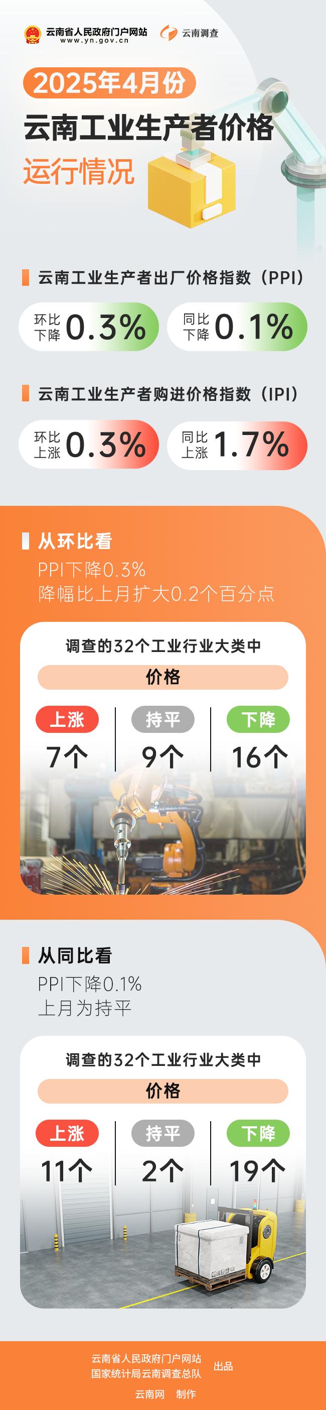 国家统计局云南调查总队根据国家现行统计调查制度开展的工业生产者价格调查结果显示:2025年4月份,云南工业生产者出厂价格指数(PPI)环比下降0.3%,同比下降0.1%;购进价格指数(IPI)环比上涨0.3%,同比上涨1.7%。