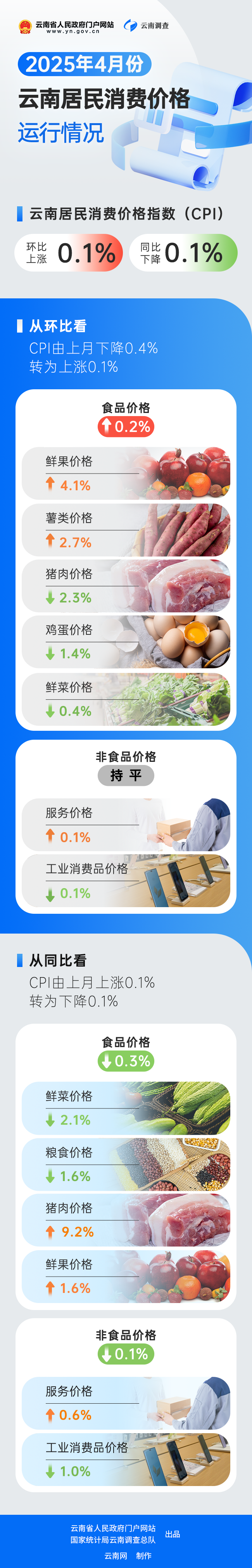 国家统计局云南调查总队根据国家现行统计调查制度开展的居民消费价格调查结果显示:2025年4月份,云南居民消费价格指数(CPI)环比上涨0.1%,同比下降0.1%。扣除食品和能源价格的核心CPI同比上涨0.5%,涨幅比上月扩大0.1个百分点,继续保持温和回升的态势。