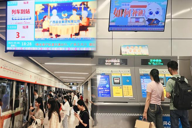 图为在南宁地铁站里展播食盐科普动画片以创新发展引领产业升级