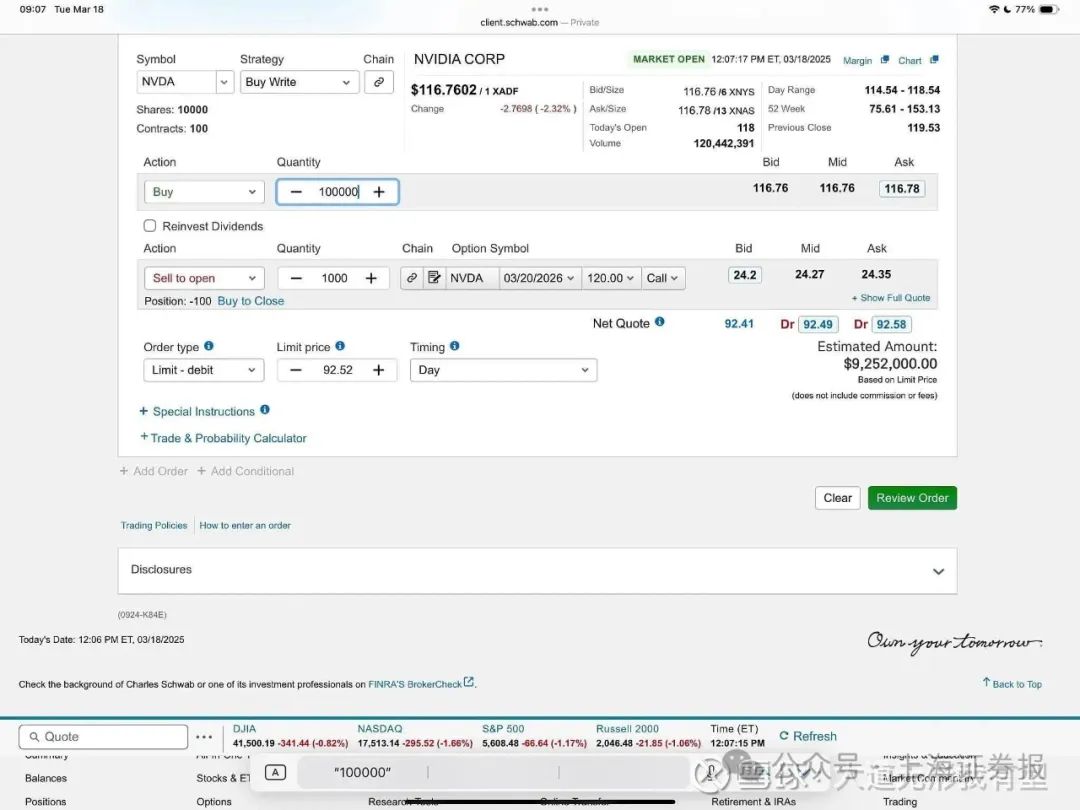 今年3月份,段永平表示买入英伟达。他晒出的买单显示,他采用的是Buy Write(买入并卖出认购期权)策略,以92.52美元的限价买入10万股英伟达股票,同时以120美元的行权价卖出看涨期权,合约到期日是2026年3月20日。