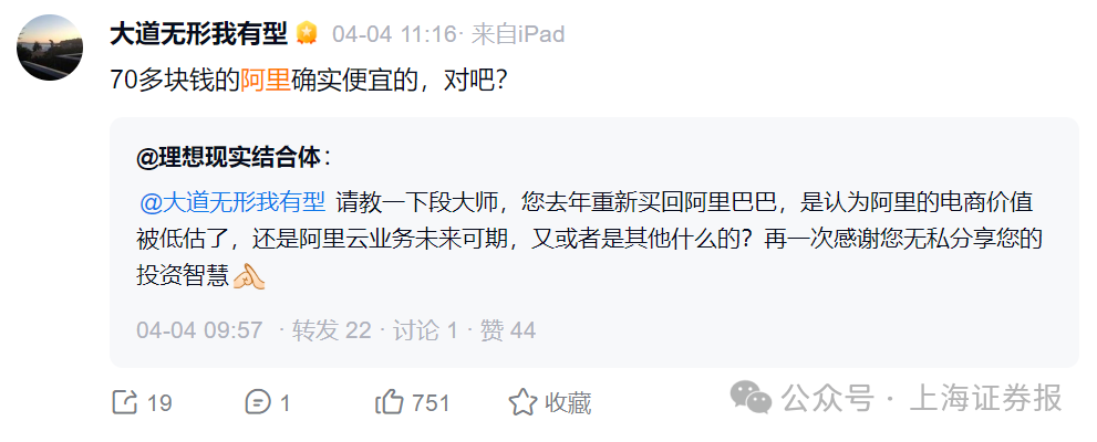 2024年,段永平大举买入阿里巴巴。今年4月初,在回答网友提问时,段永平曾表示“70多块钱的阿里确实便宜的,对吧”。