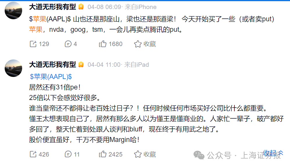 4月8日,段永平表示:“山也还是那座山,梁也还是那道梁!今天开始买了一些(或者卖put)苹果,nvda,goog,tsm,一会儿再卖点腾讯的put。”