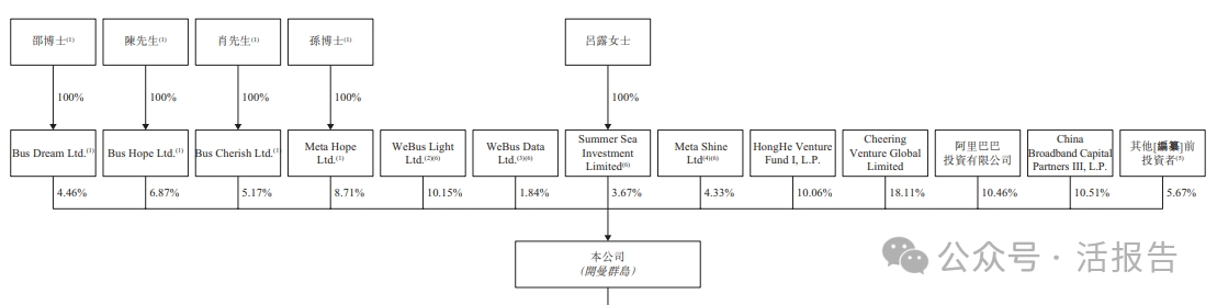 孙博士与陈先生、肖先生、及其各自的控制实体(即Meta Hope、Bus Hope及Bus Cherish)为一致行动方,连同邵博士的Bus Dream合计持股约25.21%;股份激励平台WeBus Light Ltd.、WeBus Data Ltd.合计持股约11.99%。