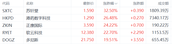 美股异动丨苏轩堂涨32.5%,为涨幅最大的中概股